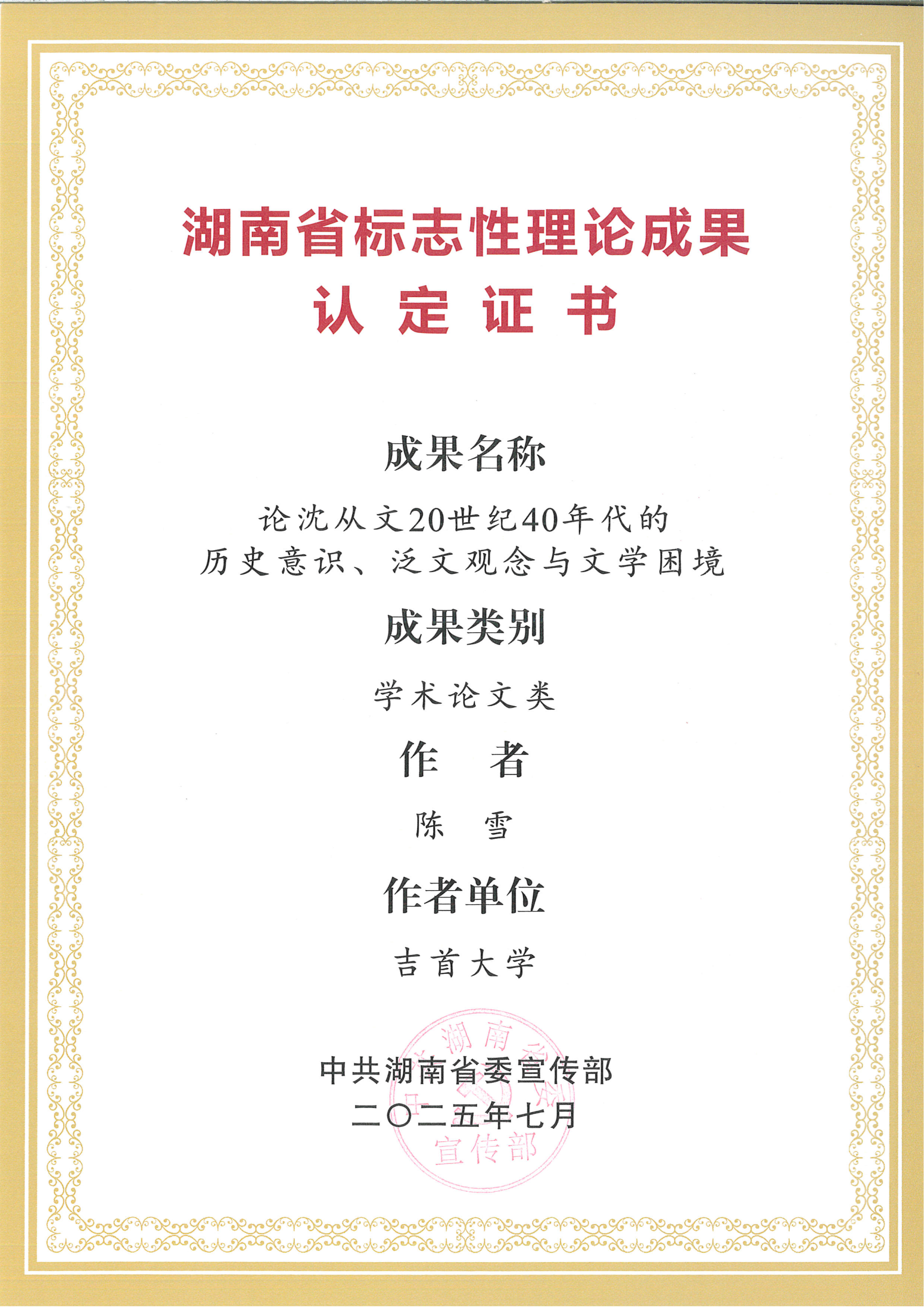 陈雪论文《论沈从文20世纪40年代的历史意识、泛文观念与文学困境》 湖南省标志性理论成果 省级 中共湖南省委宣传部 2025.7 第一 |