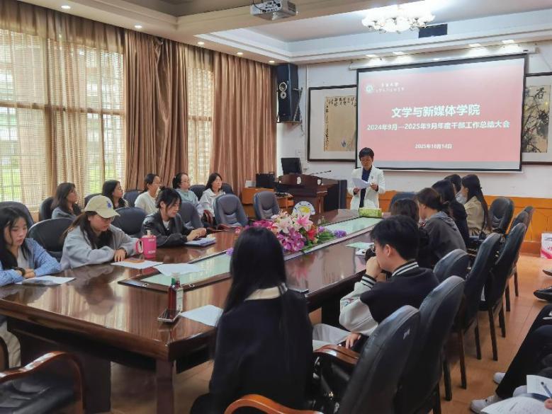 (通讯员:陈惠)10月14日下午,文学与新媒体学院2024年9月——2025年9月年度学生干部工作总结大会在砂子坳校区影视鉴赏室举行。大会由研究生秘书向超老师主持,第四届、第五届研究生会全体成员及2024级、2025级班委共同参会。