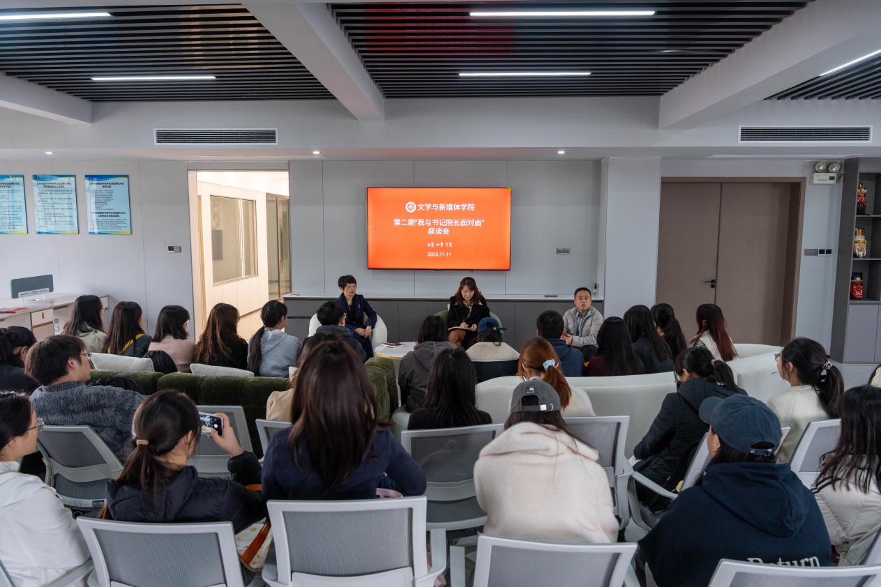 本网讯(通讯员 肖哲宇 谭亚迪)11月11日下午,文学与新媒体学院在总理楼融媒体中心举行第二期“我与书记院长面对面”座谈会,学院党委书记杨帆、院长瞿建慧、院党委副书记彭俊与学生代表欢聚一堂,共话学风建设,交流本科教学审核评估工作。